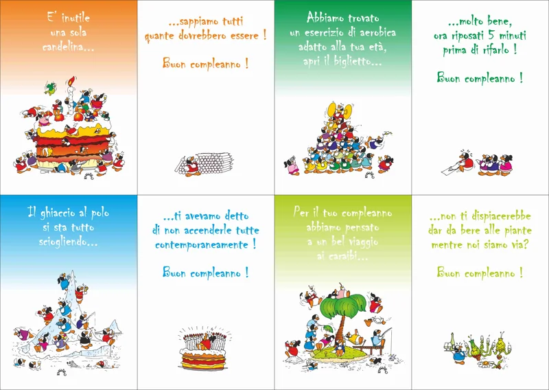La serie di biglietti augurali di compleanno in italiano con i spiritosi pinguini di Englaro, con busta e confezionati singolarmente